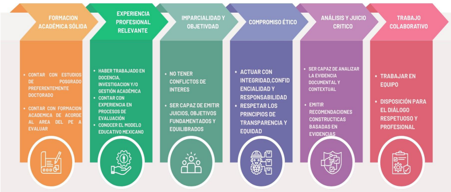 Para desempeñar su función con eficacia, los pares evaluadores deben poseer competencias profesionales, personales y psicosociales, entre las que destacan el dominio disciplinar, la capacidad analítica, la ética profesional, la objetividad, el trabajo colaborativo y la sensibilidad a los contextos institucionales (Vera, 2015); (Rodríguez, 2020). De esta forma, su labor no solo se limita a emitir juicios y brindar un acompañamiento académico orientado a promover la mejora continua de las instituciones de educación superior en México, sino también contemplar la idoneidad de los procesos de evaluación en materia de actualización de sus conocimientos y experiencia, para obtener su certificación profesional (Secretaría de Educación Pública [SEP], s.f.).