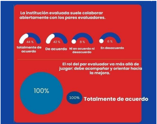 Es por ello que derivado de la investigación realizada podemos determinar que contamos con el 47% de pares evaluadores que cuentan con más de 6 años de experiencia, lo que permite una amplia confiabilidad en los resultados de las acreditaciones obtenidas en las Instituciones de Educación Superior. Es imperativo mencionar que los evaluadores son conscientes de la importancia de realizar dichas funciones con objetividad e imparcialidad en todo momento, ya que el 90% lo afirman. Mientras el 94% asevera que la formación ética del par evaluador es clave para asegurar la calidad del proceso. Si bien es cierto que los evaluadores en un 44% opinan que la institución evaluada suele colaborar abiertamente con los pares evaluadores, se debe concientizar a la Institución a evaluar la importancia de la colaboración abierta para una mejora continua y poder cumplir el objetivo de acreditación; ya que el 100% de los evaluadores coinciden que su rol va más allá de juzgar, debe ser percibido como acompañamiento, orientación y lograr la mejora continua constante.