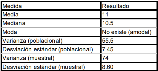 En la siguiente tabla se muestran diversas medidas estadísticas con sus respectivos resultados