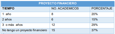 Por último, la Figura 5 muestra los lapsos de tiempo en los cuales los docentes tienen planificado algún proyecto financiero. Es importante destacar que 37% estableció que no cuentan con ningún proyecto financiero, seguido por proyectos financieros en plazos de 3 años o más con un 29%, proyectos de un año por 20% y se finaliza con los proyectos financieros de 2 años con un 15%.