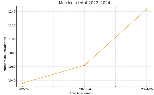 La matrícula total mostró un crecimiento sostenido en el periodo analizado. En 2022 se registraron 1,036 estudiantes, en 2023 la cifra aumentó a 1,062 y en 2024 alcanzó 1,143. Este incremento acumulado de 10.3 % refleja la capacidad de la FIMCN para atraer y retener estudiantes en programas de calidad.