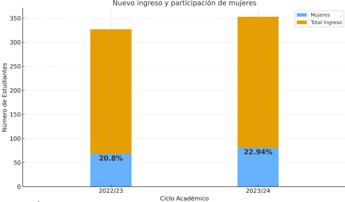 En términos de equidad de género, el porcentaje de mujeres en el nuevo ingreso pasó de 20.8 % en 2023 a 22.94 % en 2024. Aunque la proporción sigue siendo menor que la de los varones, la tendencia positiva muestra un avance importante en equidad de género.