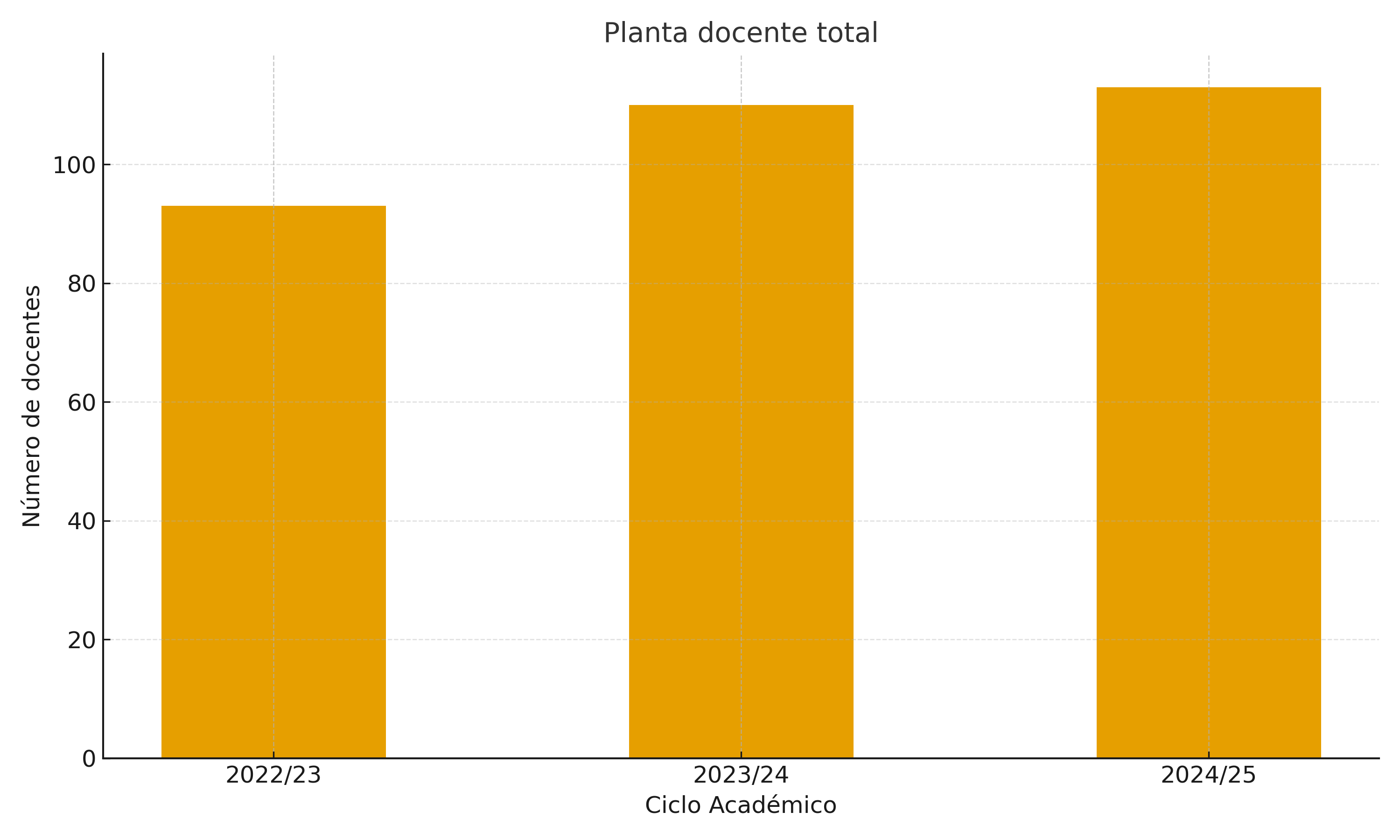 La planta docente mostró un crecimiento tanto en número como en grado académico. En 2022 se contaba con 93 docentes y en 2023 con 110. Para 2024 la cifra ascendió a 113, con más del 90 % de los profesores con estudios de posgrado. Este indicador asegura la pertinencia y calidad de la enseñanza, y fortalece el perfil académico de la entidad.