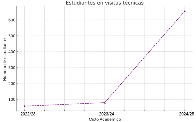 La vinculación con el sector productivo y la formación práctica se fortalecieron a través de visitas técnicas. En 2022 participaron 57 estudiantes, en 2023 se registraron 79, y en 2024 la cifra ascendió a 655, equivalente al 57.3 % de la matrícula total. Este aumento refleja la consolidación de la relación universidad–empresa y el compromiso de la FIMCN con la formación aplicada.