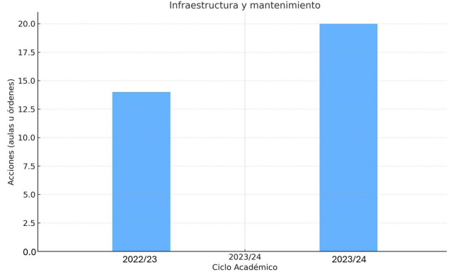 En materia de infraestructura, en 2023 se entregó formalmente un edificio de 2,130 m² con 14 aulas, con capacidad simultánea para 630 estudiantes, además de la atención ordenada de solicitudes de mantenimiento durante 2024, priorizando espacios de uso académico intensivo.
