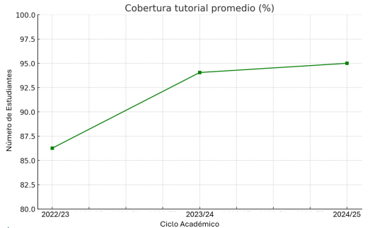 La cobertura tutorial alcanzó un crecimiento importante: del 86.26 % en 2022 se pasó al 94.05 % en 2023 y al 95 % en 2024. Esto refleja la consolidación de la estrategia de acompañamiento académico, clave para la reducción de la deserción y el fortalecimiento de la eficiencia terminal